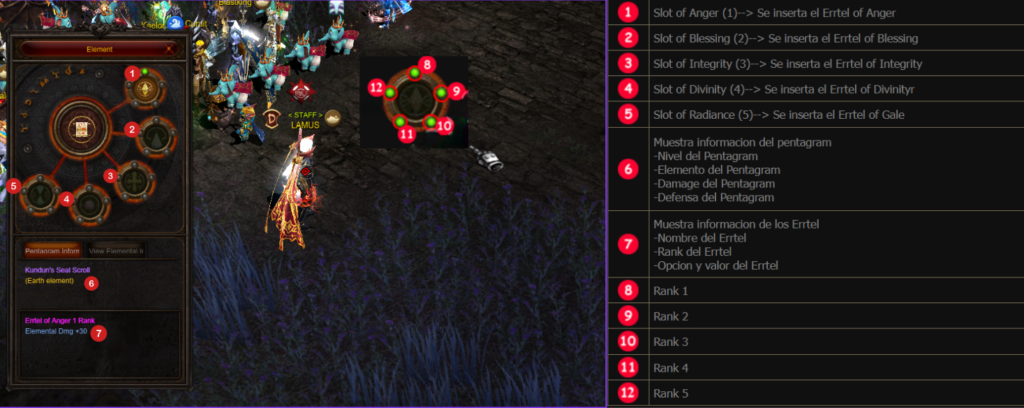 El Pentagram define qué tipo de elemento vas a usar y te permite insertar Errtels, que son piedras elementales con diferentes efectos (con ALT+Click derecho puedes abrir el pentagram para ver mayor detalle).